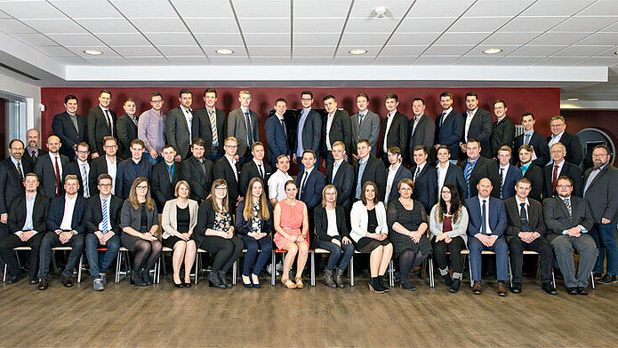 Der ganze Stolz des Unternehmens: Die ehemaligen Werft-Azubis haben sich zum großen „Familienfoto“ zusammengefunden (Foto: Meyer Werft)
