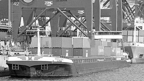 Die Binnenschifffahrt sieht sich als umweltfreundlicher Verkehrsträger – hier ein Containerbinnenschiff in Rotterdam, Foto: Arndt
