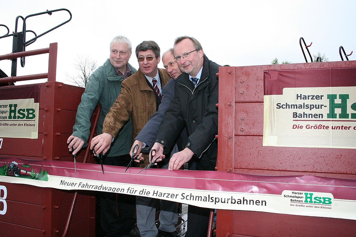 (v.l.): Egbert Thiele, stellv. Bürgermeister der Stadt Gernrode; Gert Sauer, Bürgermeister von Bad Suderode; Dr. Eberhard Brecht, Bürgermeister der Stadt Quedlinburg und Matthias Wagener, Geschäftsführer der HSB nehmen den neuen Fahrradtransportwagen offiziell in Betrieb; Foto: Harzer Schmalspurbahnen GmbH