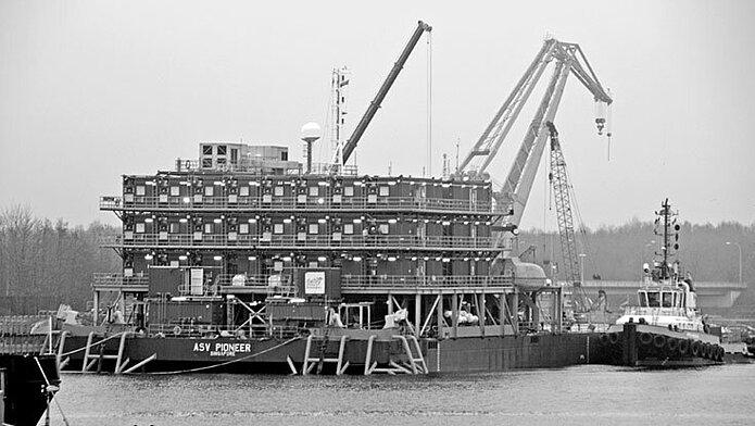 Die „ASV Pioneer“ wurde 2007 in China bei Nantang Tongsheng Ship Manufacturing gebaut. Eigner ist die ASV Pioneer Ltd. Als Charterer der Spezialbarge agiert die Dalby Offshore Service. An Bord können 118 Personen (erweiterbar) wohnen. Das in Singapur registrierte Schiff war unter anderem beim Havarieeinsatz an der „Costa Concordia“ in Italien beteiligt. Der Luxusliner hatte am Abend des 13. Januar 2012 bei einem riskanten Manöver vor der toskanischen Insel Gi glio einen Felsen gerammt und war mit mehr als 4200 Menschen an Bord in Schieflage geraten. Unter den 32 Toten waren 12 Deutsche.