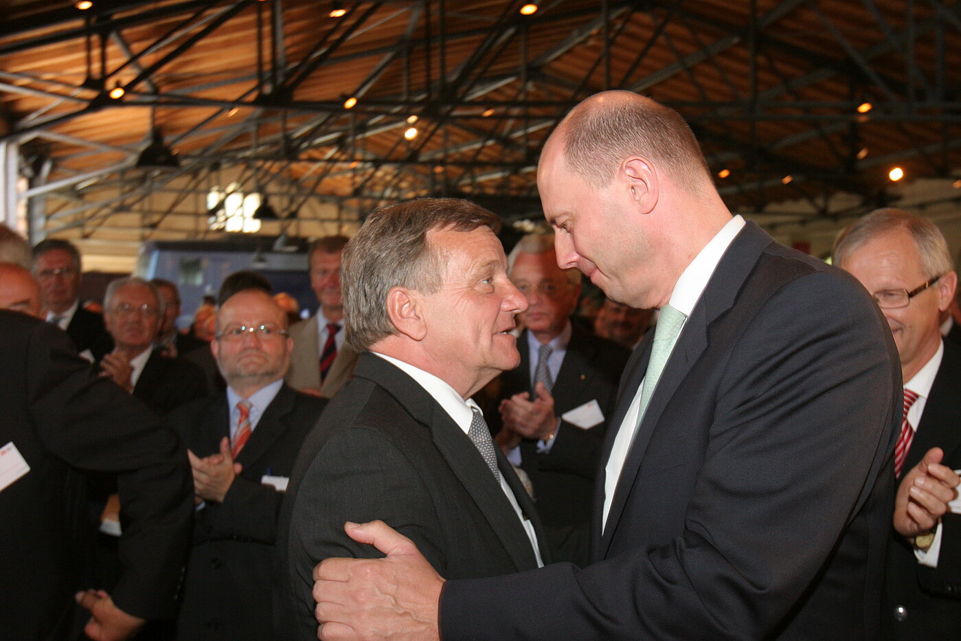 Verkehrsminister Wolfgang Tiefensee verabschiedet Hartmut Mehdorn gestern Abend in Berlin; Foto: T. Heinrici