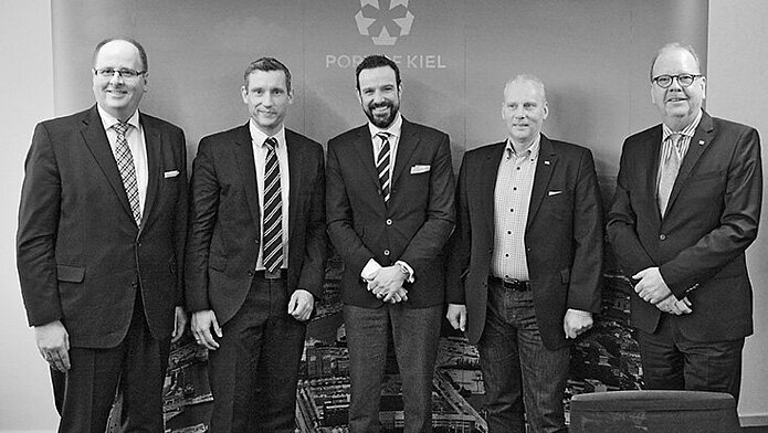 Foto: Port of Kiel, Von links: Jörn Grage, Geschäftsführer SCA Logistics, Jacob Andersen, Director Route & Agency DFDS, Dirk Claus, Martin Wahl und Ulrich Kock