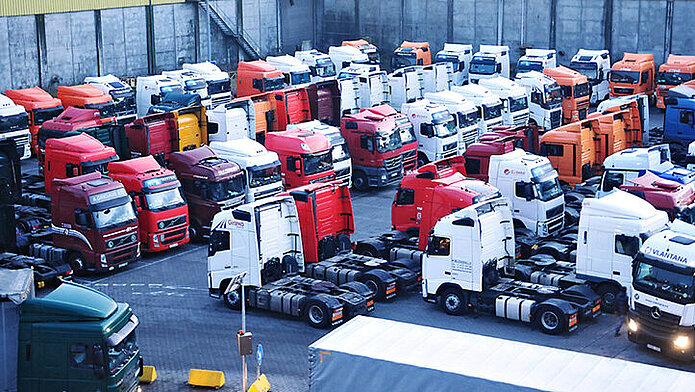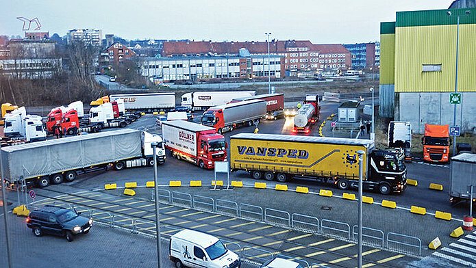 Stau im Kieler Ostuferhafen nach Sperrung der polnischen Grenze für russische Lkw, Foto: Behling