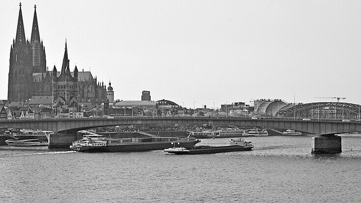Lebensader und Wirtschaftsweg: der Rhein, hier in Köln. Binnenschiffe prägen das Bild, Foto: HGK