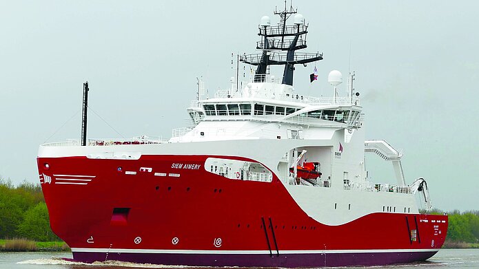 Der rot-weiße Anstrich und das yachtähnliche Design machten den Neubau auf der deutschen Schifffahrtsstraße zum besonderen Blickfang. In Zukunft wird der Offshore-Versorger auf hoher See zu sehen sein, unter anderem beim Windpark „Nordsee One“ vor der Insel Juist. Die in Danzig fertiggestellte 95-Meter-Einheit zählt zur Flotte von „Siem Offshore“. Aktuell betreibt die skandinavische Reederei 51 Schiffe, von denen sich noch sechs im Bau befinden. Die „Siem Aimery“ gehört zu den „Cable Lay Vessels“ (CLV). Auf dem unter norwegischer Flagge fahrenden Schiff finden bis zu 60 Personen und 4250 Tonnen Material Platz. Während der Verlegung der Kabel auf See, muss das Spezialschiff konstant den richtigen Kurs halten. Da die ungleiche Beschaffenheit des Meeresgrunds bei den Vorgängen eine zentrale Rolle spielt, operieren CLVs generell mit geringer Geschwindigkeit. Deshalb, und um möglichst präzise verlegen zu können, wurde auf dem skandinavischen Schiff das System „Dynamic Positioning 2“ installiert. Dadurch ist der Neubau in der Lage, Umweltkräften wie Strömung, Wind oder Seegang besser zu trotzen. Die eingebaute Manövrieranlage ist dementsprechend umfangreich – insbesondere im Vorschiff. Zusätzlich wurde das Deckshaus mittig positioniert, wovon auch die Besatzung profitiert – schließlich sind dort die Auswirkungen durch Seegang am geringsten. Des Weiteren erhielt der mit 4900 BRZ vermessene Neubau Eisklasse und eine Rumpfform, die das Brechen der Schollen vereinfacht. flu
