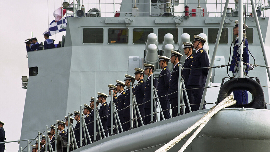 „Front nach Steuerbord“: China will mit seiner Marine bewusst weltweit Flagge zeigen – hier beim Besuch eines größeren Flottenverbandes im Januar 2015 im Hamburger Hafen, Foto: Behling