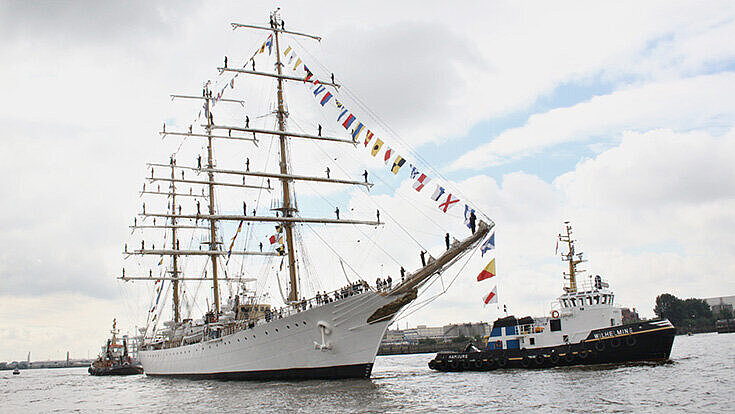 Die 1963 in Dienst gestellte Bark steuerte den Elbehafen im Rahmen ihrer 46. Ausbildungsreise an und verlässt die Hansestadt am kommenden Montag. Auf dem Weg nach Hamburg wurde das Schiff von zahlreichen Wasserschutzpolizeibooten begleitet, die anlässlich des Wirtschaftsgipfels aus allen Teilen der Republik in der Hansestadt konzentriert wurden, um vor allem den sensiblen Hafenbereich abzusichern. So ist ein wichtiger Programmpunkt des umfangreichen Gipfel-Gesamtablaufs auch ein Konzert in der neuen Elbphilharmonie („Elphi“). Bürgermeister Olaf Scholz stellte im Vorfeld fest: „Sie ist nicht nur ein herausragender Konzertsaal, sondern verkörpert als Haus für alle auch die Grundwerte der freiheitlichen, offenen und demokratischen Kultur moderner Gesellschaften.“