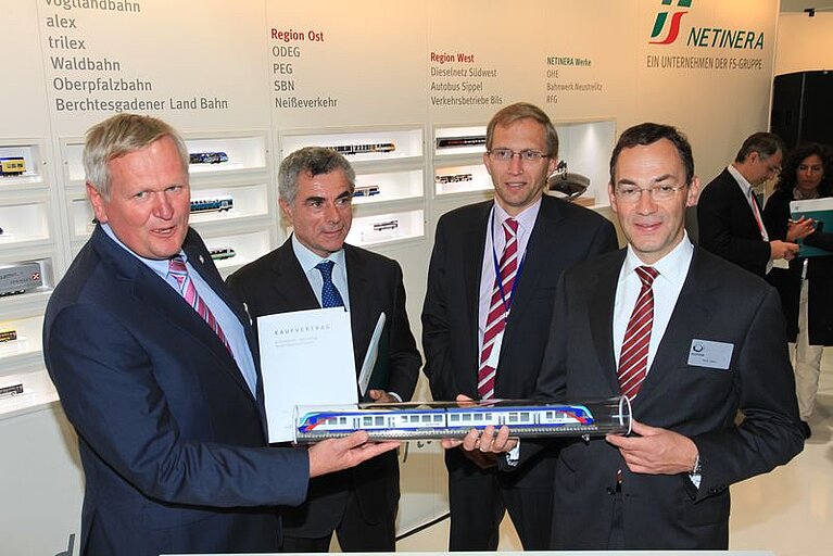 Jost Knebel von der Vogtlandbahn/Netinera, Mauro Moretti von der FS, Henry Poupart-Lafarge von Alstom sowie Martin Lange von Alstom Deutschland nach der Vertragsunterzeichnung; Foto: C. Müller