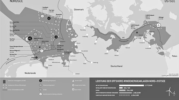 Im ersten Halbjahr 2015 gingen 422 Offshore-Wind ener gieanlagen mit einer Leis tung von insgesamt 1765,3 Megawatt (MW) neu ans Netz. Auf See speisten damit zum Stichtag 30. Juni 2015 insgesamt 668 Anlagen mit einer Leistung von zusammen 2777,8 Megawatt Strom in die Netze ein. Mit diesen Offshore-Windenergieanlagen kann das System etwa drei Millionen Haushalte mit Strom versorgen. Zudem stehen 90 Anlagen mit einer Leistung von 380,7 Megawatt vor ihrem Netzanschluss, und für 84 weitere Anlagen wurden bereits Fundamente errichtet. Daher rechnet die Branche für das Jahr 2015 insgesamt mit etwa 2250 Megawatt an neuen Offshore-Windenergie-Kapazitäten am Netz. In der deutschen Nord- und Ostsee werden zum Jahresende wie geplant Windenergieanlagen mit einer Gesamtleistung von bis zu 3300 Megawatt am Netz sein. Diese Zahlen teilte ges tern die Stiftung Offshore-Windenergie in Berlin mit.