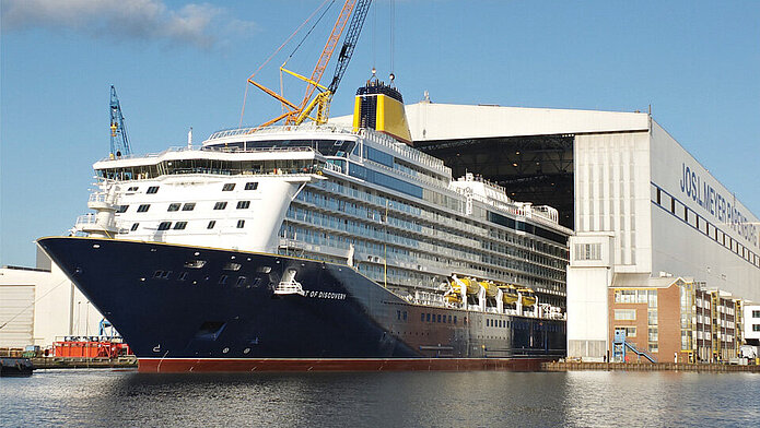 Maßarbeit: die 236 Meter lange„Spirit of Discovery“ beim Verlassen des Baudocks I der Meyer Werft, Foto: Eckardt