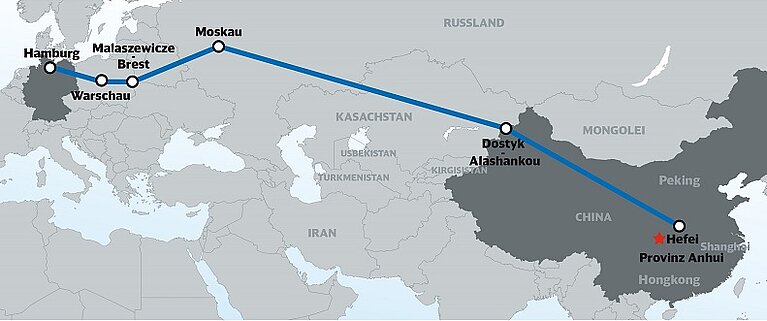 Beide Partner wollen den Schienengütertransport von Hefei nach Hamburg erstmalig aufnehmen und weiter ausbauen. Voraussichtlich ab Oktober soll zunächst ein Zug pro Woche von Ost nach West verkehren. Die Route führt auf 10.600 km über Dostyk in Kasachstan, Moskau und Warschau nach Deutschland. Rund 15 Tage benötigt ein Güterzug für diese Distanz. Hefei ist durch die zentrale Lage in der Provinz Anhui in Ostchina Güterdrehkreuz für Kunden im östlichen und südlichen China. Die Transporte organisiert Trans Eurasia Logistics, ein Joint Venture der Deutschen Bahn und der Russischen Eisenbahnen. Trans Eurasia Logistics bietet bereits seit mehreren Jahren erfolgreich Zugverbindungen zwischen Europa und zahlreichen Regionen in China an. (cm)