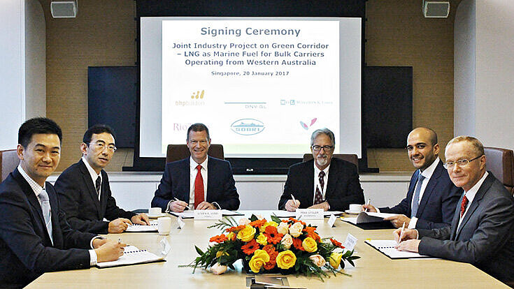 Die norwegisch-deutsche Klassifikationsgesellschaft DNV GL, der australisch-britische Rohstoffkonzern BHP Billiton, die Reederei Mitsui O.S.K. Lines, die Bergbaugesellschaft Rio Tinto, das Shanghai Merchant Ship Design & Research Institute (SDARI) und der australische Energiekonzern Woodside Petroleum vereinbarten jetzt in Singapur eine entsprechende Zusammenarbeit. Das JIP genannte Projekt soll das kommerzielle Potenzial von LNG-betriebenen Schiffen in einem „grünen Korridor“ zwischen Australien und China beurteilen. Im Zentrum steht dabei der Entwurf eines Capesize-Bulkers der neuen Generation.