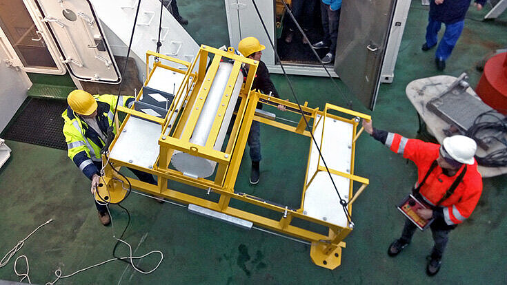 Bereit für den Einsatz: Der „Boknis-Eck Knoten“ an Bord des Forschungskutters „Littorina“ (Bild: Geomar)